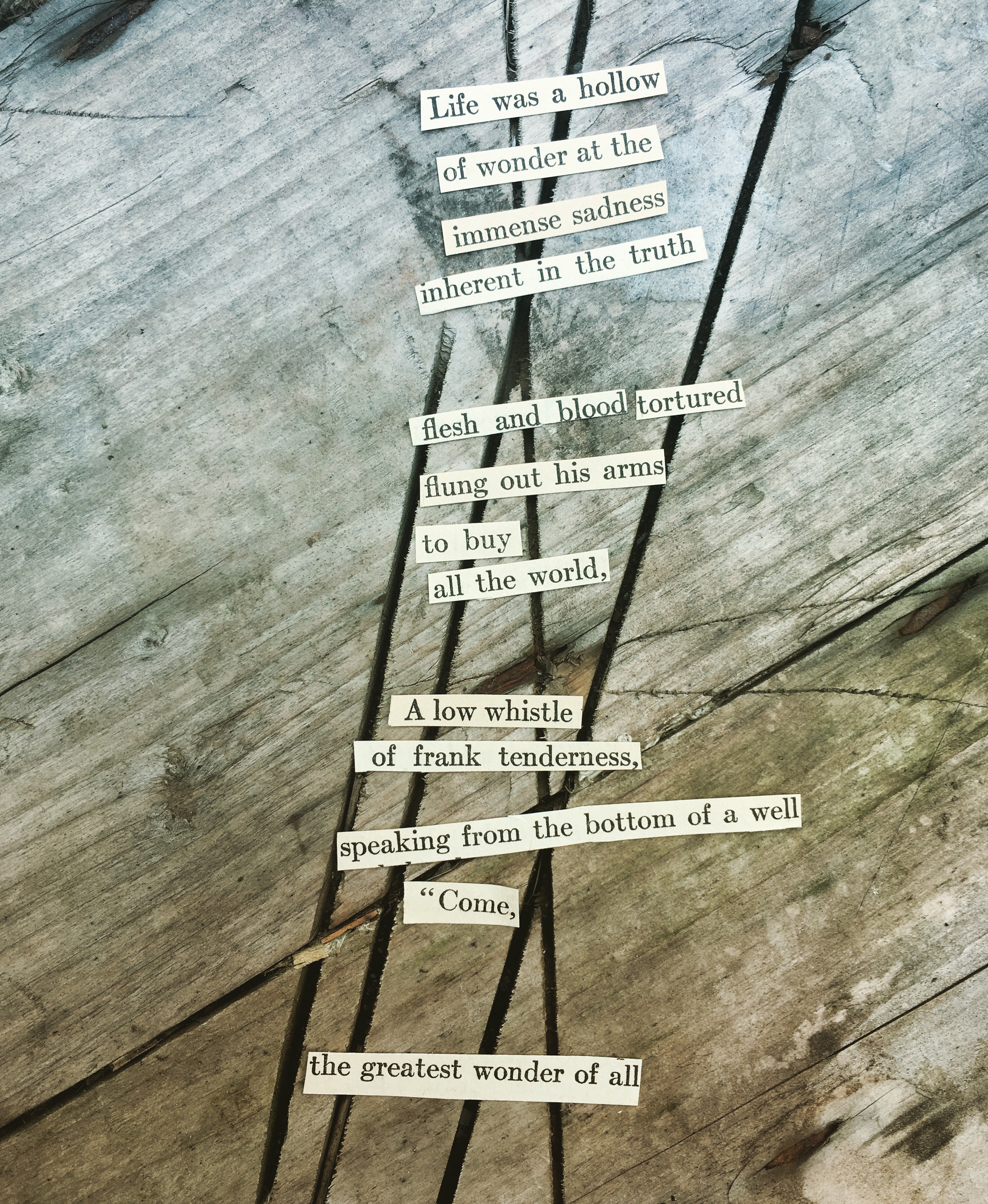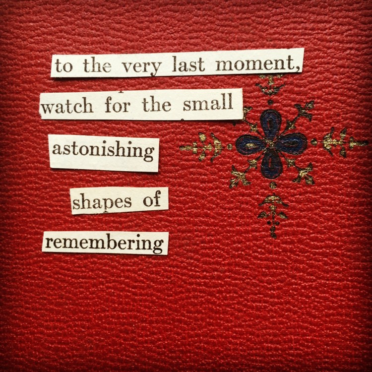 I’ve stripped off the writing habit. I’ve not written for weeks. But I’m here again to start again. I am trying a new trick of discipline to get the current of words flowing: found poems. I’ve watched a friend post them daily on Instagram, and it takes me back to the days of being a middle school English teacher. I had a corner with a metal filing cabinet covered with magnetic words for creating poems. Even my most reluctant students loved this exercise. The words are all there. Just arrange them. How hard can it be? Baby steps. So I’ve posted my first and my habit is to create one a day; find my corner and find some words and lay them out to be swept away after being photographed. Nothing too serious or permanent. The first is below.